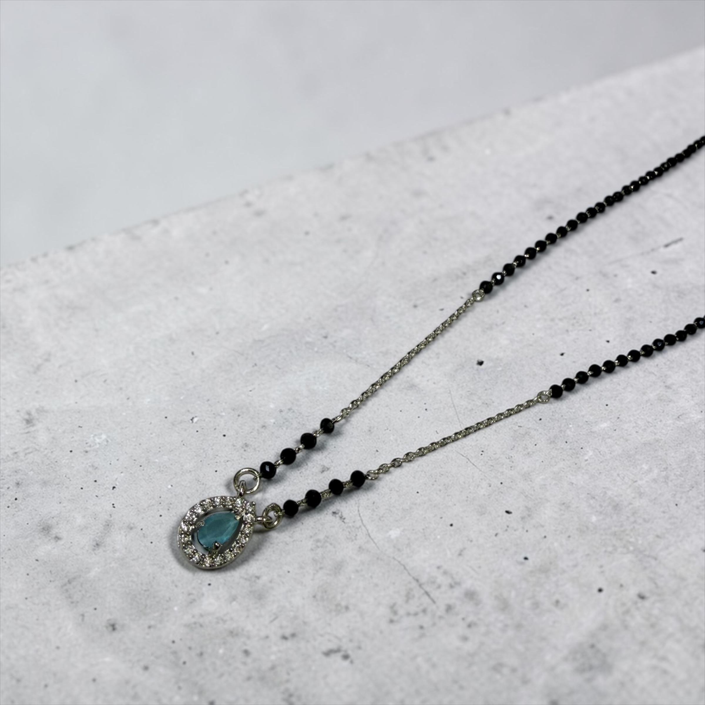 Soft, elegant, and refreshingly modern. This dainty mangalsutra features a serene aqua blue teardrop stone set in a shimmering halo of cubic zirconia.