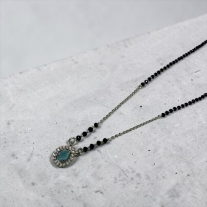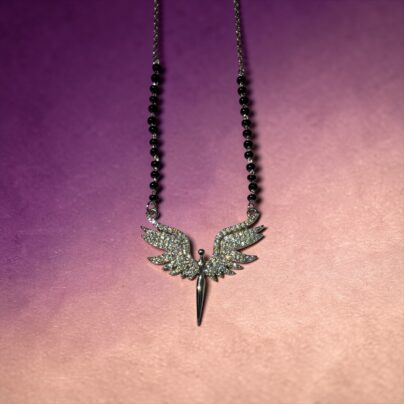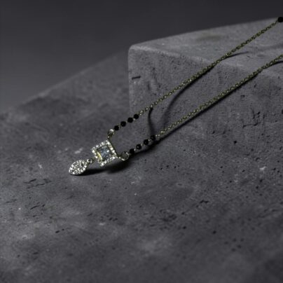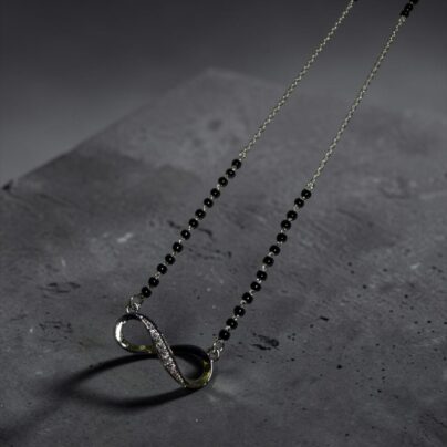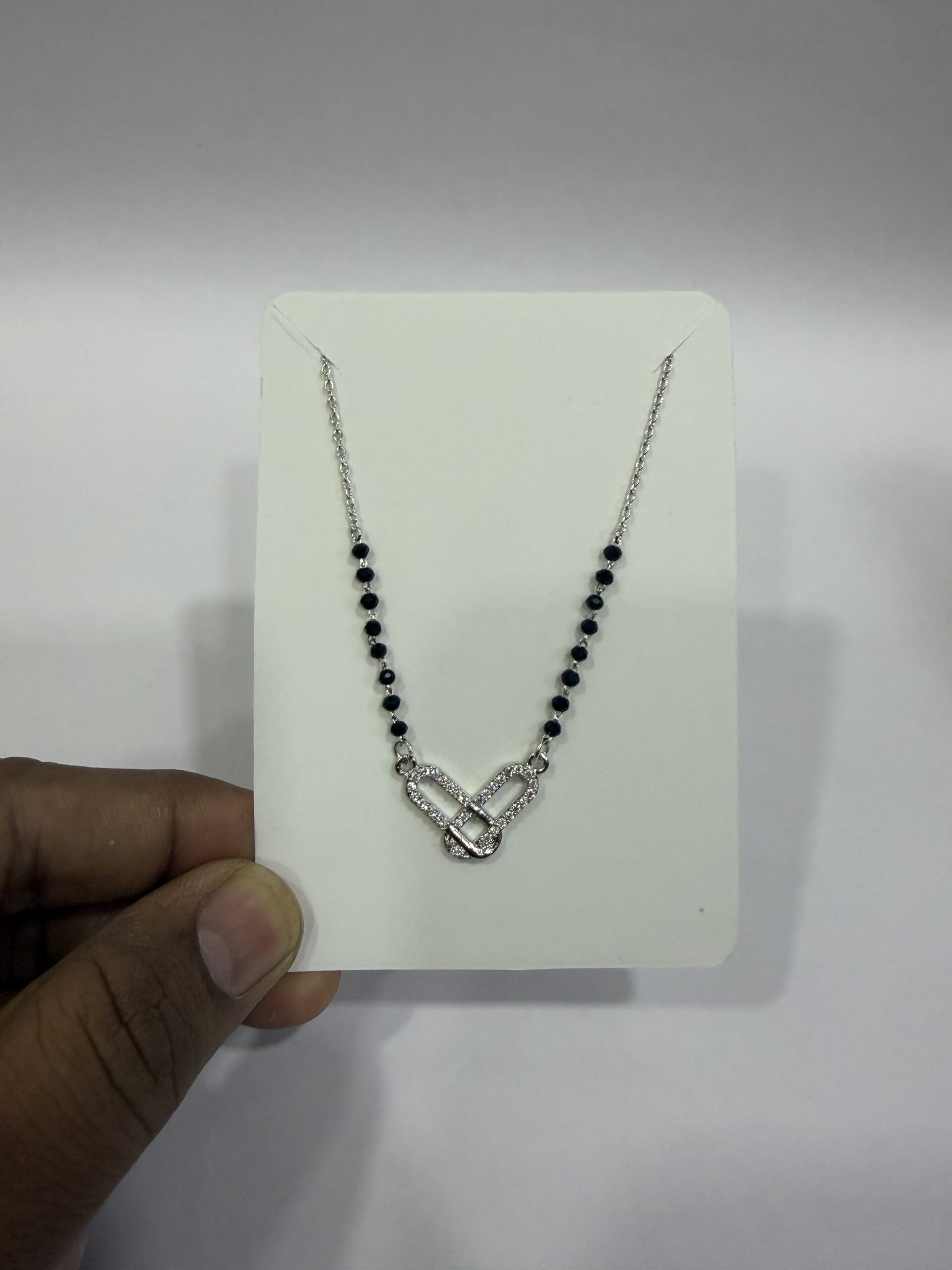 Two hearts, one bond. This contemporary mangalsutra features two delicate heart-shaped links that interlock at the center, both fully lined with sparkling cubic zirconia.