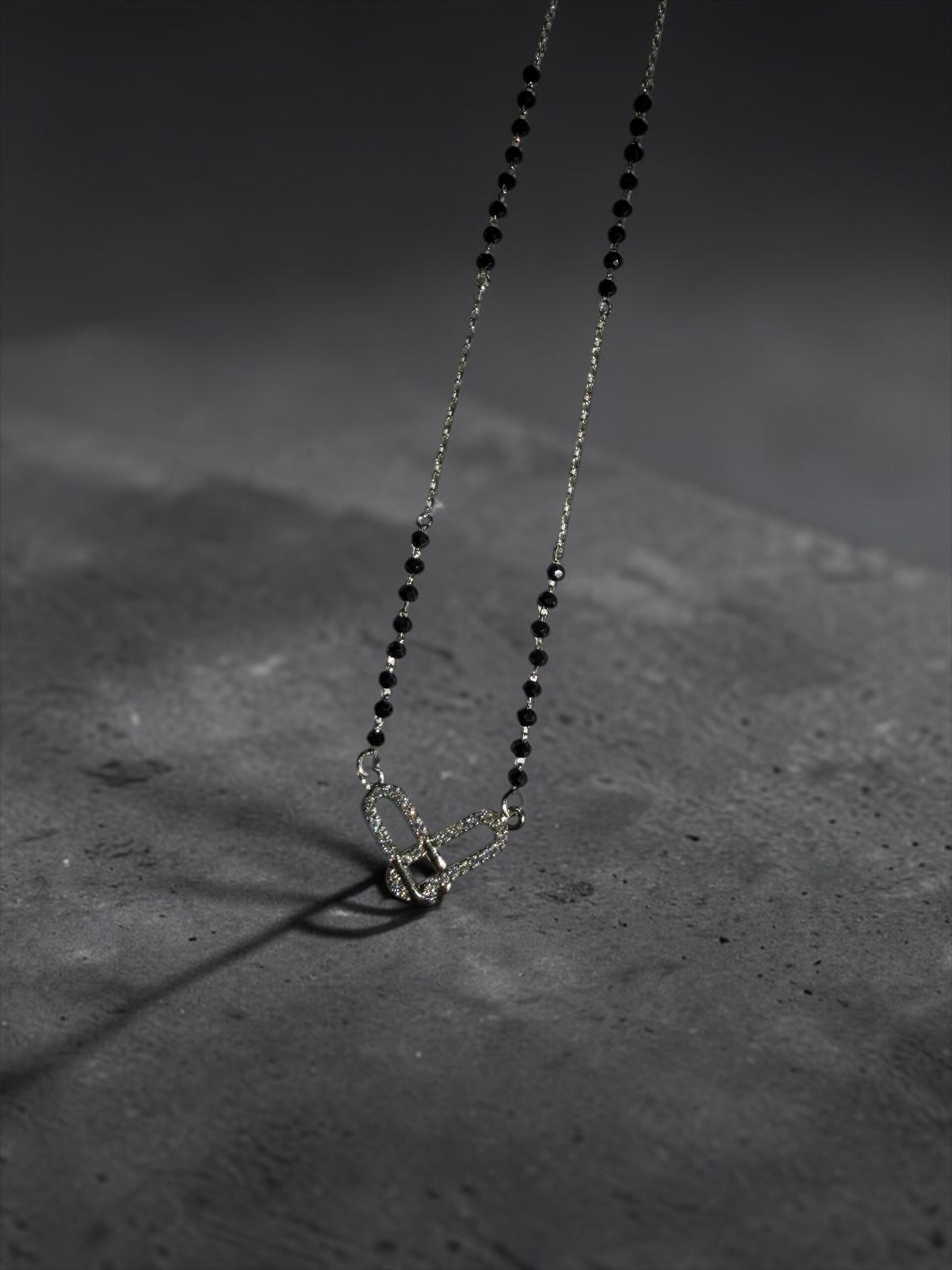 Set on a fine silver chain with classic black beads, it symbolizes connection and togetherness in a minimal, everyday design.